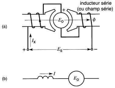 Dans un moteur shunt, le flux 0 par pôle est constant pour toute charge normale, car l'inducteur shunt est connecté à la source de tension, laquelle est fixe. Mais dans un moteur série, le flux dépend du courant qui circule dans l'induit; par conséquent, le flux croît avec le courant de charge.