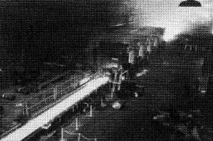 Figure 28-10 Laminoir à chaud. Le laminage est effectué par 6 laminoirs consécutifs actionnés chacun par un moteur à c.c. de 2500 kW. La feuille d'acier laminé est ensuite entraînée vers la gauche par 161 moteurs à c.c. de 3 kW