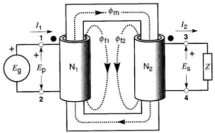 Le flux Φ créé par le primaire peut être subdivisé en deux parties: un flux mutuel Φm1 qui accroche les spires du secondaire, et un flux de fuite Φf1, qui ne les accroche pas.