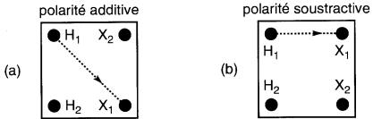 On dit alors que les bornes 1 et 3 possèdent la même polarité. On l'indique en plaçant un gros point noir vis-à-vis de la borne 1 et un autre vis-à-vis de la borne 3.