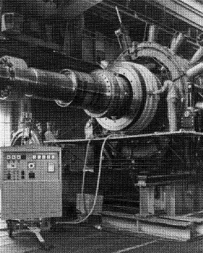Pour ce faire, on enroule à la main un bobinage composé d'un fi d'amiante ultra-flexible autour de l'anneau. Ce bobinage, alimenté par la source mobile de 35 kW, 2000 Hz visible à gauche, agit comme primaire, tandis que l'anneau d'acier agit comme secondaire en court-circuit.
