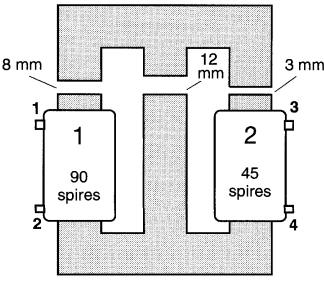 La partie supérieure du noyau est séparée de la partie inférieure par trois entrefers, ayant des longueurs respectives de 8 mm, 12 mm et 3 mm. Les enroulements 1 et 2 possèdent respectivement 90 et 45 spires.