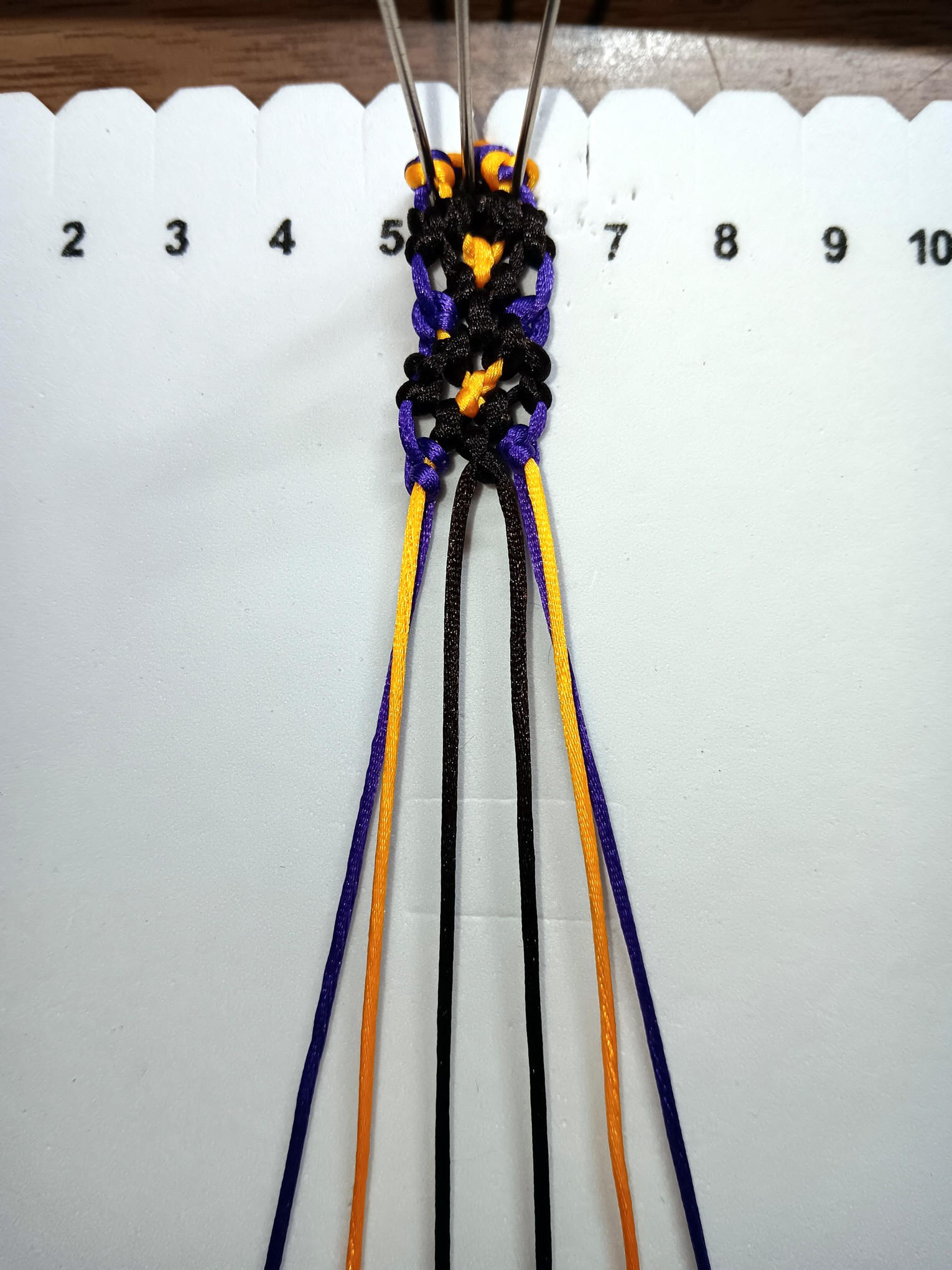 11. Pour changer de couleur, utilisez le brin extérieur gauche pour faire deux nœuds droits avec les deux fils suivants en allant vers le centre du bracelet.