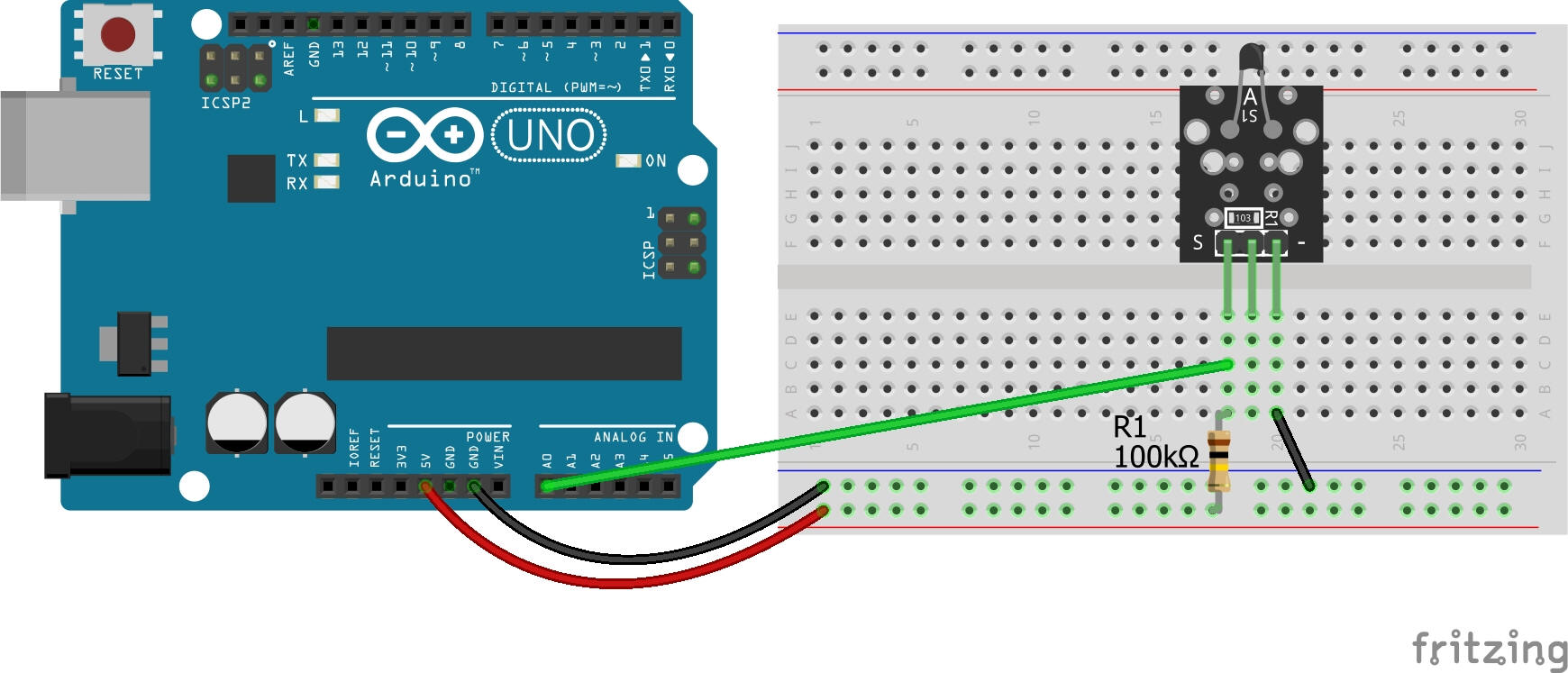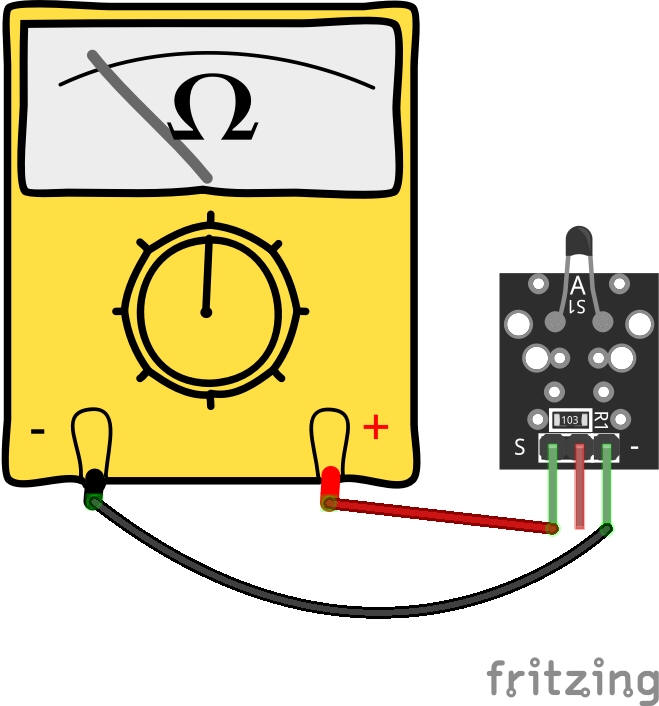 Circuit for a 10K NTC Thermistor Connect module power line V+ (middle) and ground (-) to 5V and GND on the Arduino respectively. Connect the module signal pin (S) to pin A0 on the Arduino. Some KY-013 have a different pin arrangement. Please check your board before connecting. |