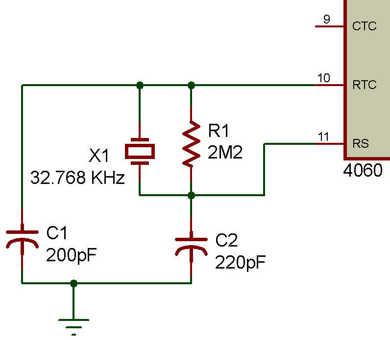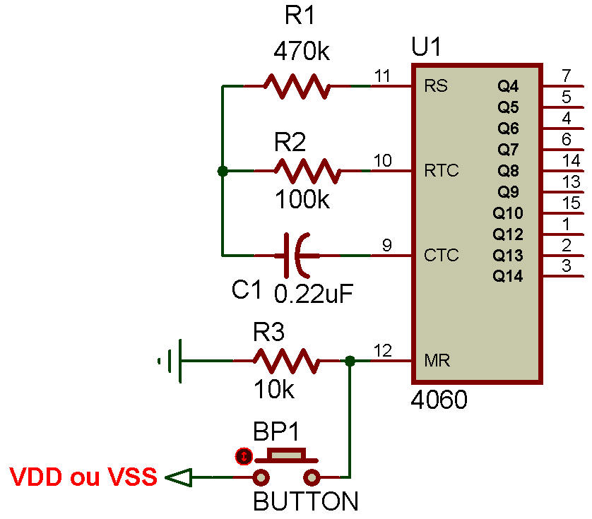 How To Use The CD4060 First of all, you need to connect the VDD (VSS) pin (16) to your positive supply terminal and the GND pin (8) and Reset (12)to your negative supply terminal. You can use a power supply voltage between 3V and 15V. Although, some versions of the 4060 chip support up to 20V. Check your datasheet for exact values. To activate the oscillator, connect a resistor from the R pin (10), a capacitor from the C pin (9), and a resistor from the CLK pin (11), and connect all three of them at the other end: |
