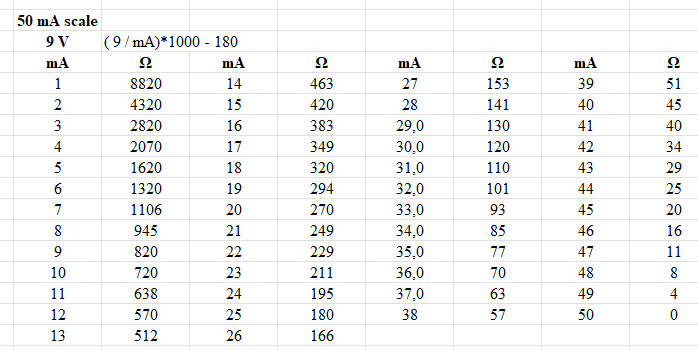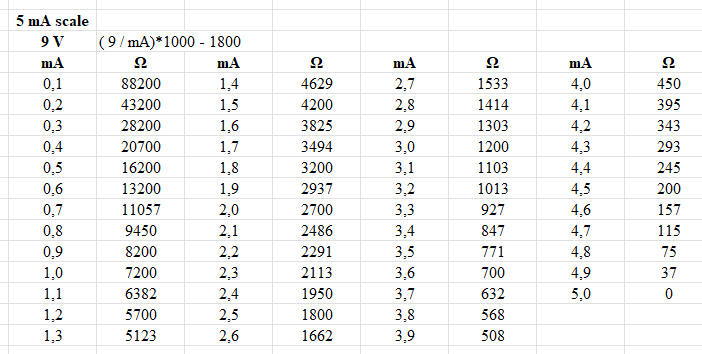 Voir plus bas pour le tableau complet des déviations pour 1 mA. |