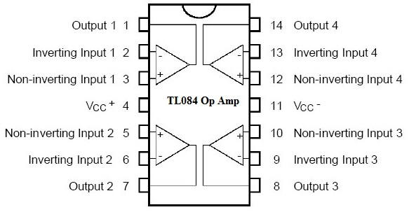 Feature High Input Impedance: 10,000,000,000,000 ohms Input offset voltage options of 6.0 mV and 15 mV Max. Low input Bias Current: 30pA Low Input Offset Current: 5.0pA Wide Gain Bandwidth: 4.0 MHz High Slew Rate: 13V/uS Low Supply Current: 1.4mA per Amplifier Maximum Ratings Positive Supply voltage: VCC = +18V (Recommend +5V to +15V) Negative Supply voltage: VSS = -18V (Recommend -5V to -15V) Differential Input Voltage (VID): +/-30V Input Voltage Range(VIDR): +/- 15V Power Dissipation (PD): 680mW Operating Ambient Temperature Range (TA): 0 to +70C Storage Temperature Range (Tstg): -65 to +150C TL084 Pinout Look above is TL084 pinout and pin connection inside them. You can use only one, two op-amp section. But should connect all unused input to ground. To reduce noise. |