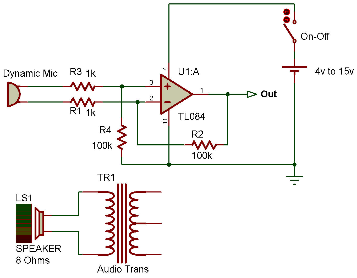 works Here is a NON-Inverting Amplifier. It’s more convenient when to use a single power supply, 4V to 15V. Because both resistors R3, R4 connect together in voltage divider form. R3 = 100k And Capacitors coupling an audio signal. The microphone gets any sounds to convert to an audio signal. C1 passes that signal through R2 to non-inverting input pin 3. We use R1 and RV1 to control the gain of this circuit. Gain = 1+ (VR1/R1). So, we can control the gain by RV1. We can use low or medium impedance Dynamic Microphone to this circuit. |