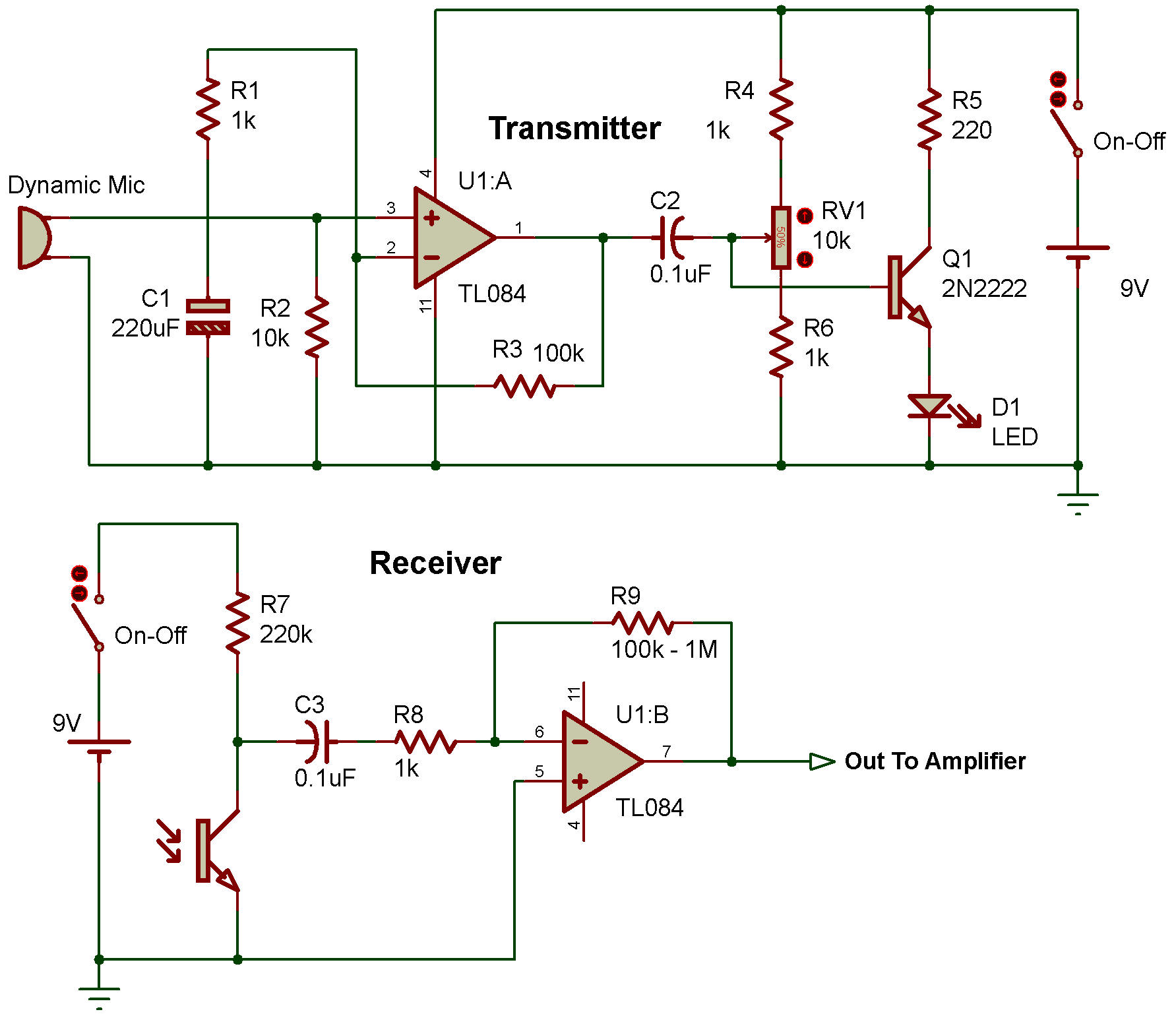 Voice Communicator using TL084 There is 2 section. Transmitter: We use the Dynamicrophone preamplifier to get a voice to a signal. Then, use Q1-transistor to drive higher signal to the infrared LED. To transform the signal to infrared light. We adjust RV1 to control a quality sound or a current to LED1. Which R5 limits a max current no more than 40mA. Receiver: The phototransistor will convert an infrared light signal to an audio signal. Then U1/B amplifies a signal to more higher. To go the input of power amplifier. |