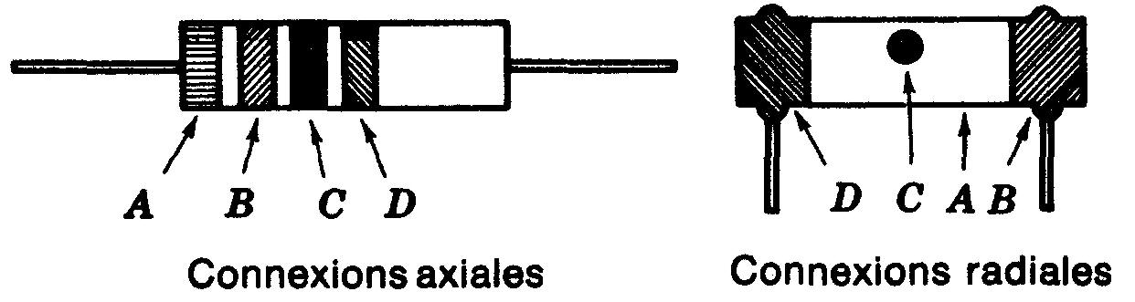 Pour les résistances à connexions axiales, repérées par des bandes de couleurs, la couleur du corps n'est pas considérée comme une couleur codée.