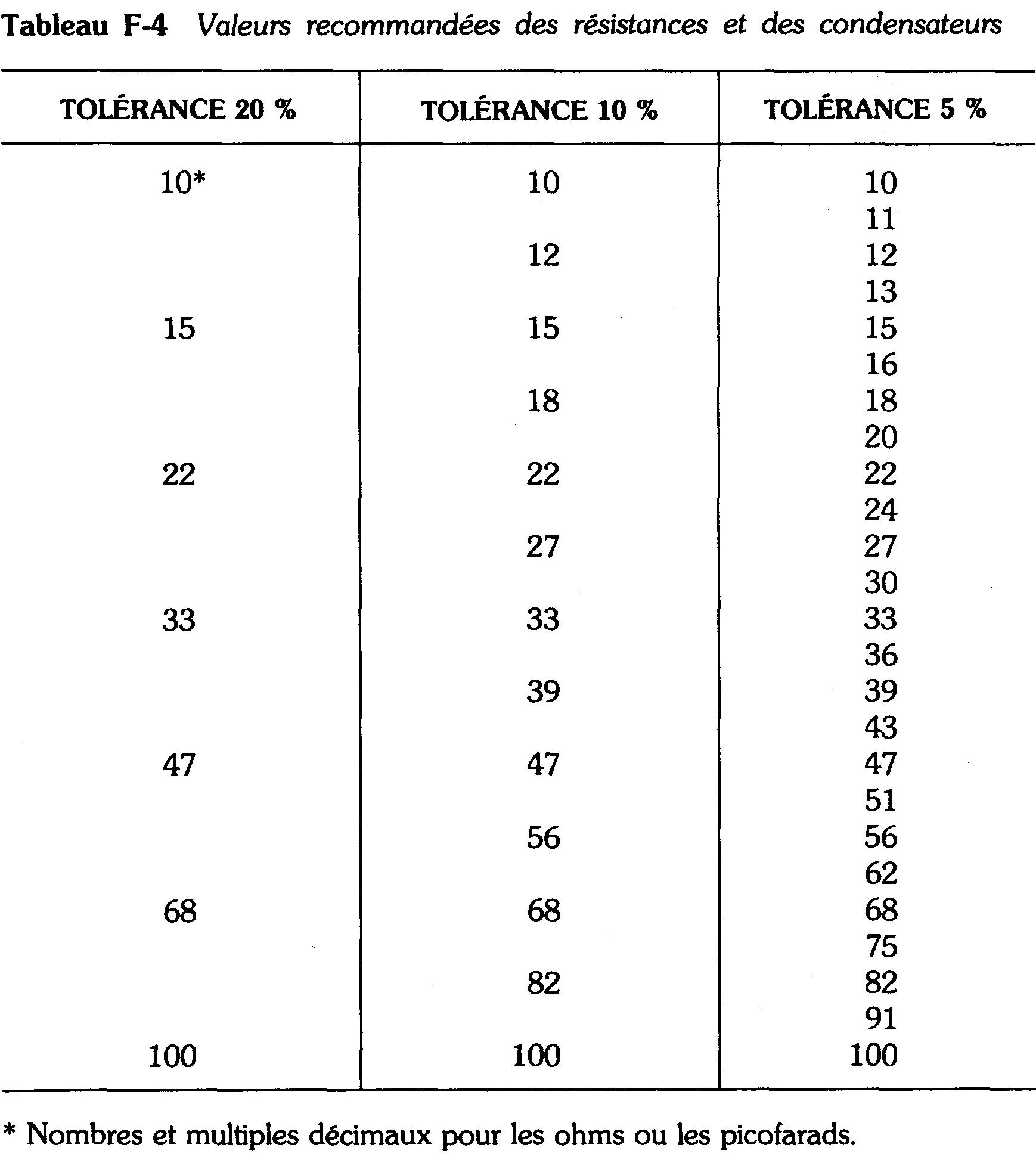 De la même manière, les valeurs recommandées du tableau F-4 s'appliquent aux valeurs des résistances en ohms ou des condensateurs en picofarads.