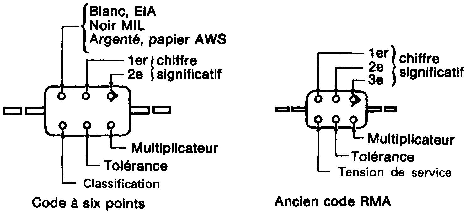 Si le premier point a une couleur, cela signifie que le code utilisé est l'ancien code à six points EIA, qui utilise les quatre premiers points pour indiquer la valeur du condensateur.