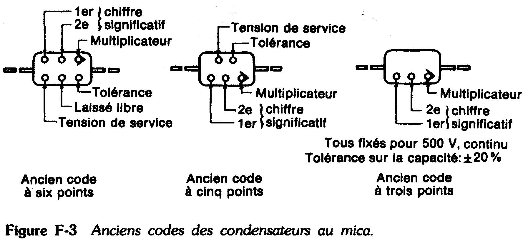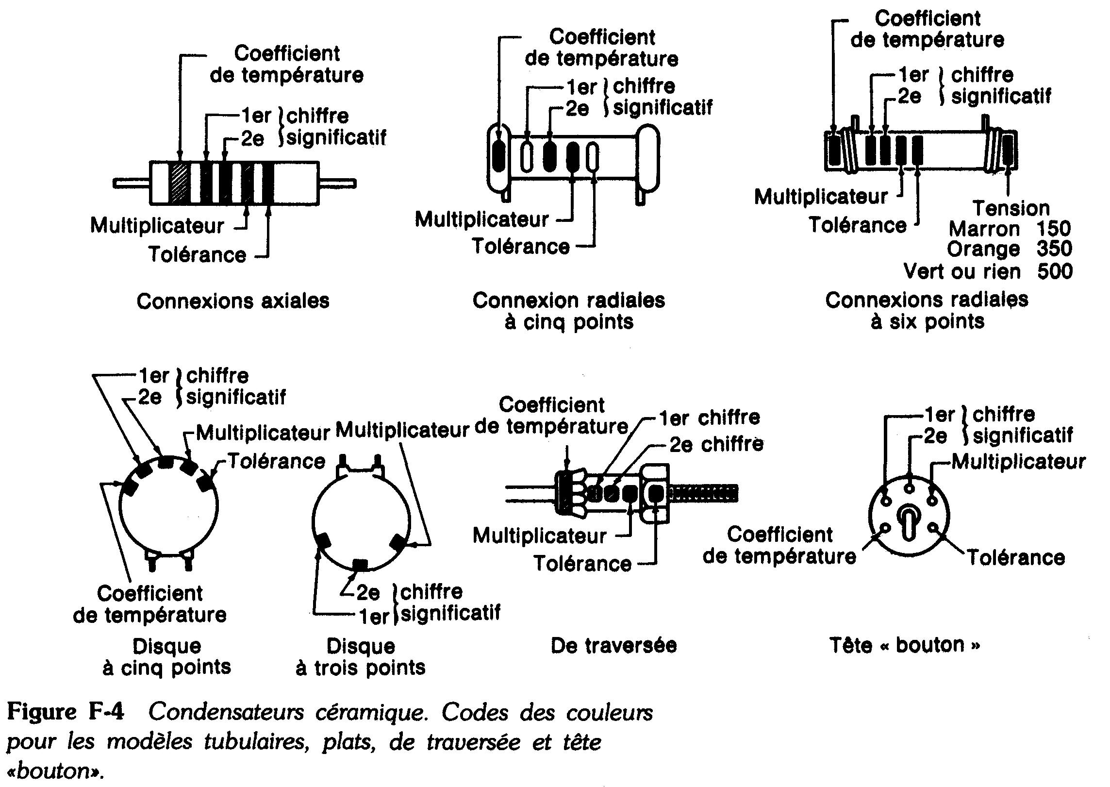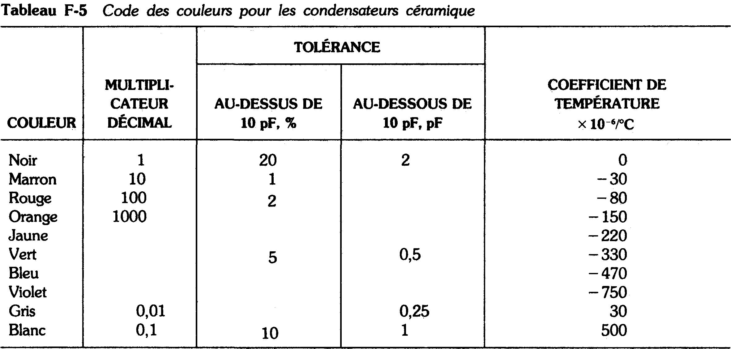 Les couleurs indiquées au tableau F-3 s'appliquent à la fois aux résistances et aux condensateurs. Cependant, les couleurs indiquant la tension nominale ne s'appliquent qu'aux condensateurs.