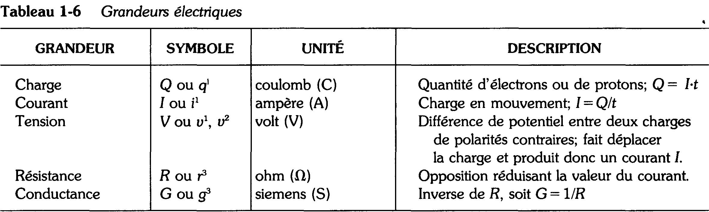 9. Le tableau 1-6 énumère les caractéristiques des circuits électriques.