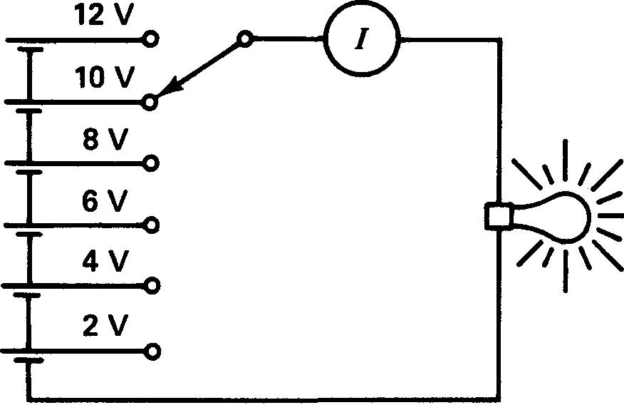 La tension V appliquée peut, par exemple, varier de 0 à 12 V. La lampe a un filament de 12V qui utilise normalement la tension maximale pour que le courant produit donne un éclairage normal.