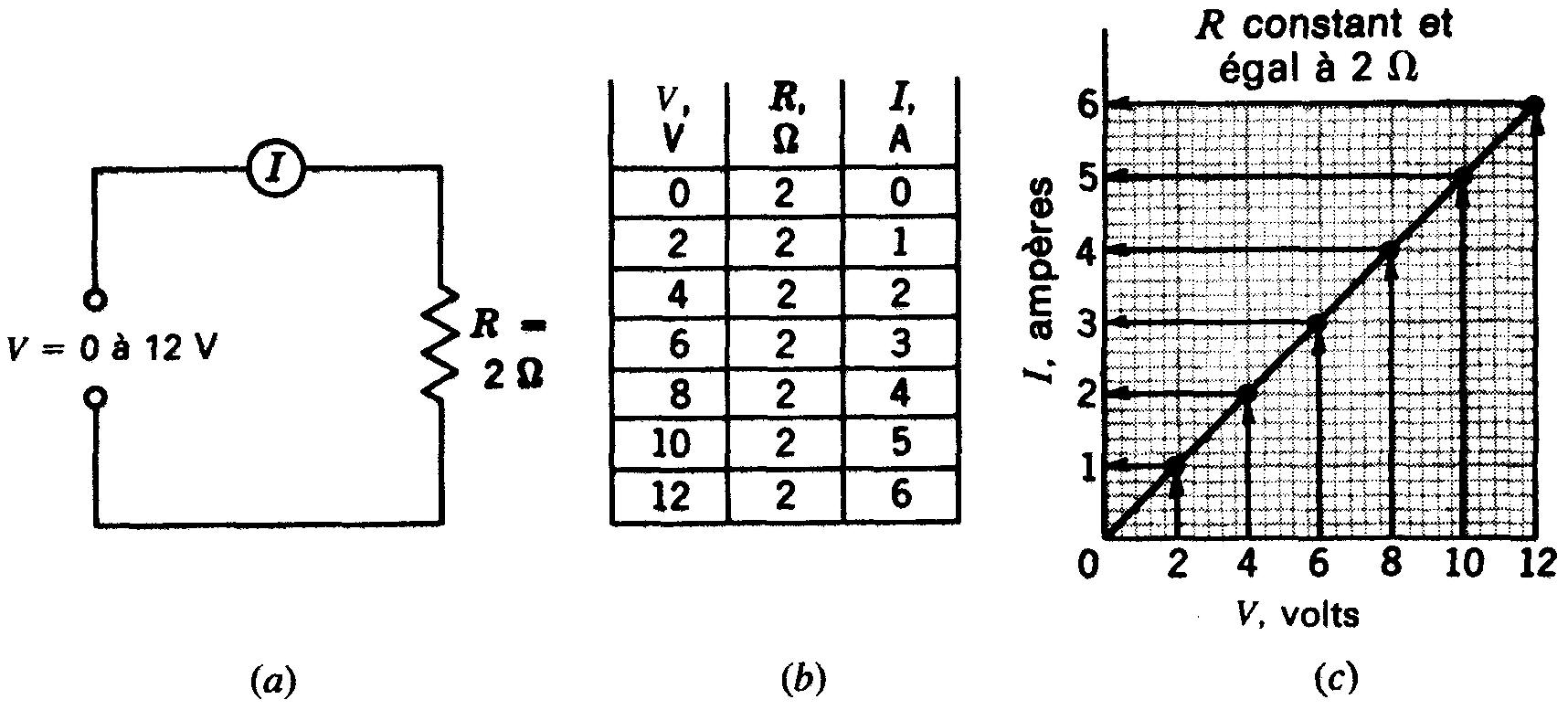 3. La résistance R étant constante, l'intensité du courant I croît en proportion directe de l'augmentation de V. Cette relation linéaire entre V et I est représentée sur la figure 2-5.