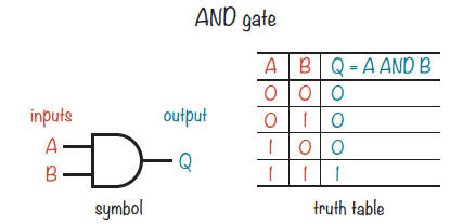 Une porte AND possède deux entrées ou plus (A et B, par exemple) et une sortie (Q, par exemple).