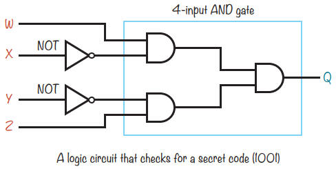 Vous pourriez ensuite laisser l'alarme activée pendant votre absence ; si quelqu'un ouvrait la porte, il devrait connaître le bon code pour désactiver l'alarme. Grâce aux portes logiques, un circuit peut facilement vérifier si le bon code a été saisi.