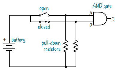 Chaque résistance de rappel à la terre de ce schéma est connectée à un interrupteur et à une entrée de grille d'un côté,