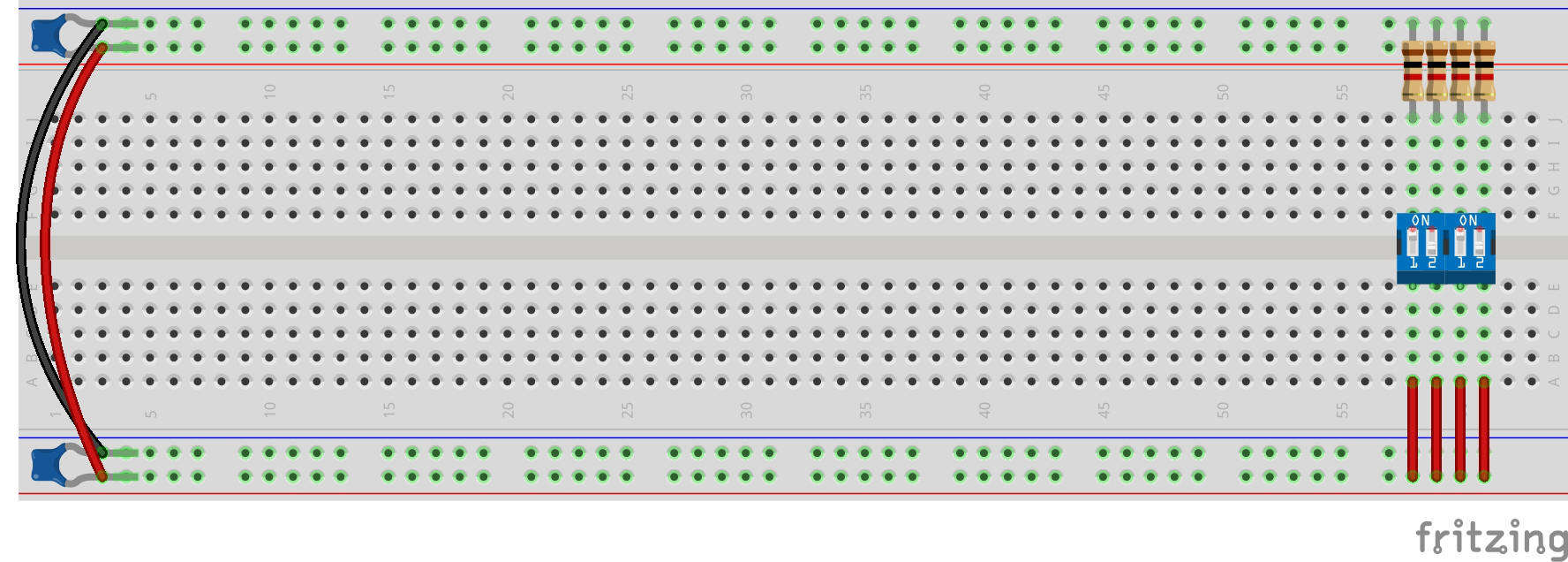 Utilisez des cavaliers pour relier le côté gauche de chaque interrupteur DIP au rail d'alimentation positif, et connectez une résistance de 1 kΩ du côté haut de chaque interrupteur DIP au rail d'alimentation négatif.