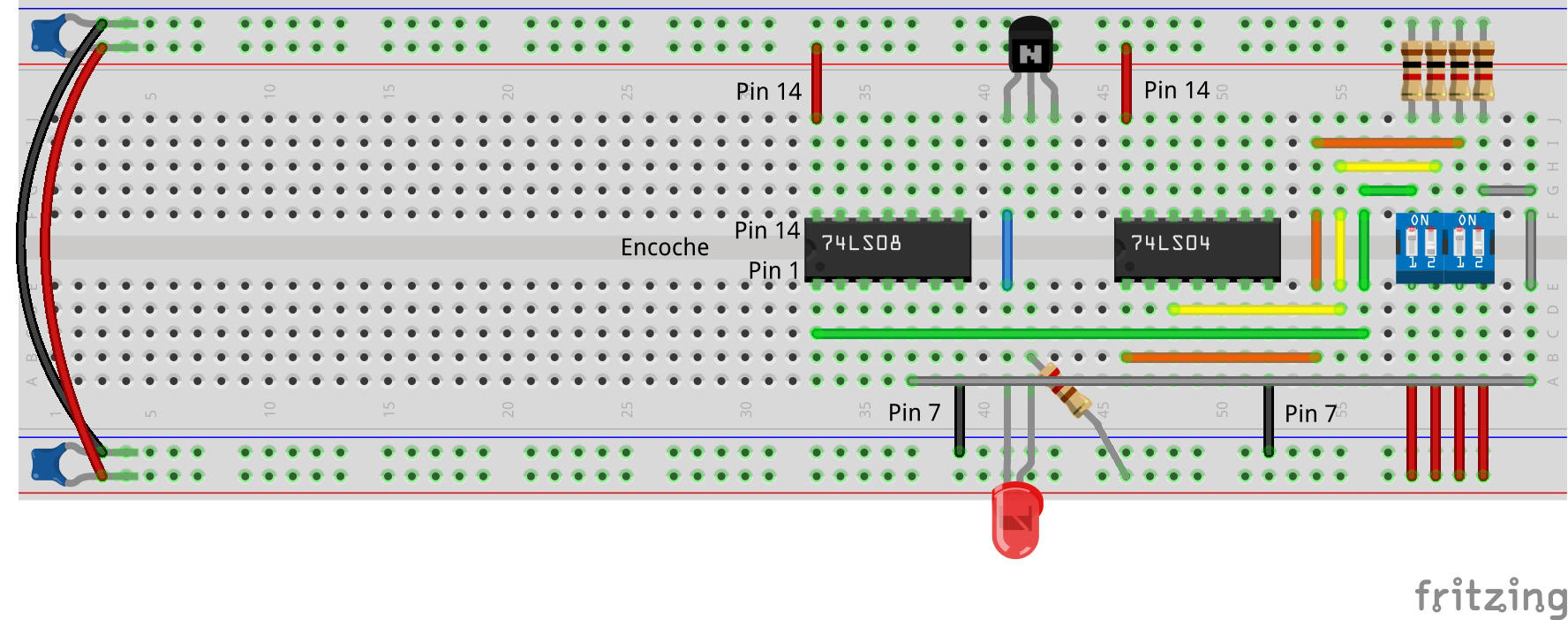Enfin, connectez un fil de liaison à la dernière sortie de la porte AND 74LS08, broche 8 à la base du transistor.