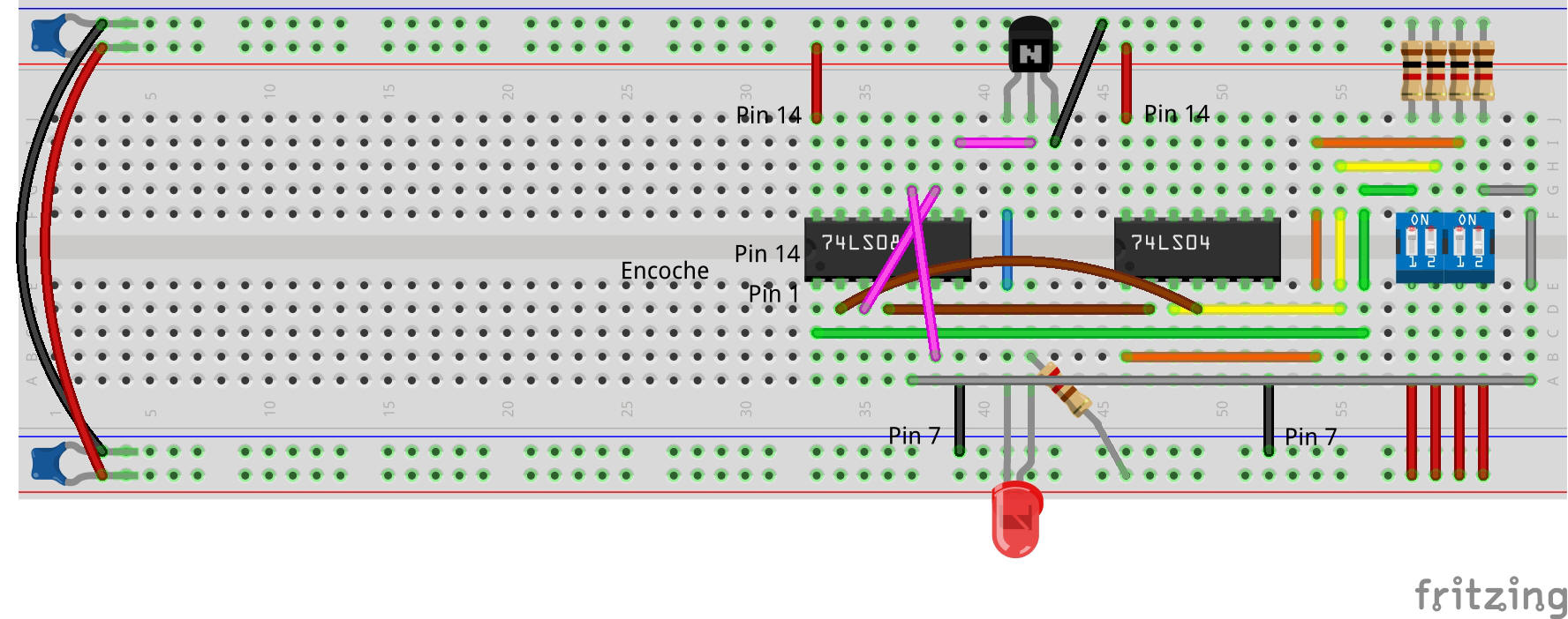 L'autre fil de liaison relie la broche 2 du 74LS04 à la broche 4 du 74LS08. Fils