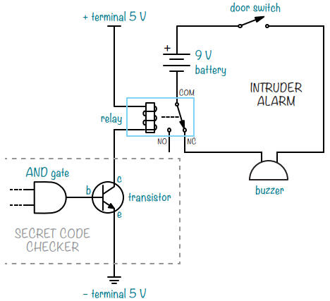 Au lieu d'une LED et d'une résistance, vous pouvez connecter un relais au vérificateur de code secret et combiner ce projet avec l'alarme anti-intrusion que vous avez construite à la section Qu'est-ce que l'électricité ?.