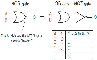 La porte NOR fonctionne comme une porte OU avec un inverseur en sortie. La sortie est à 1 lorsque A et B sont tous deux à 0.