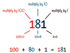 Une fois ces chiffres multipliés par leurs valeurs de position, vous pouvez additionner les valeurs obtenues pour obtenir 181.