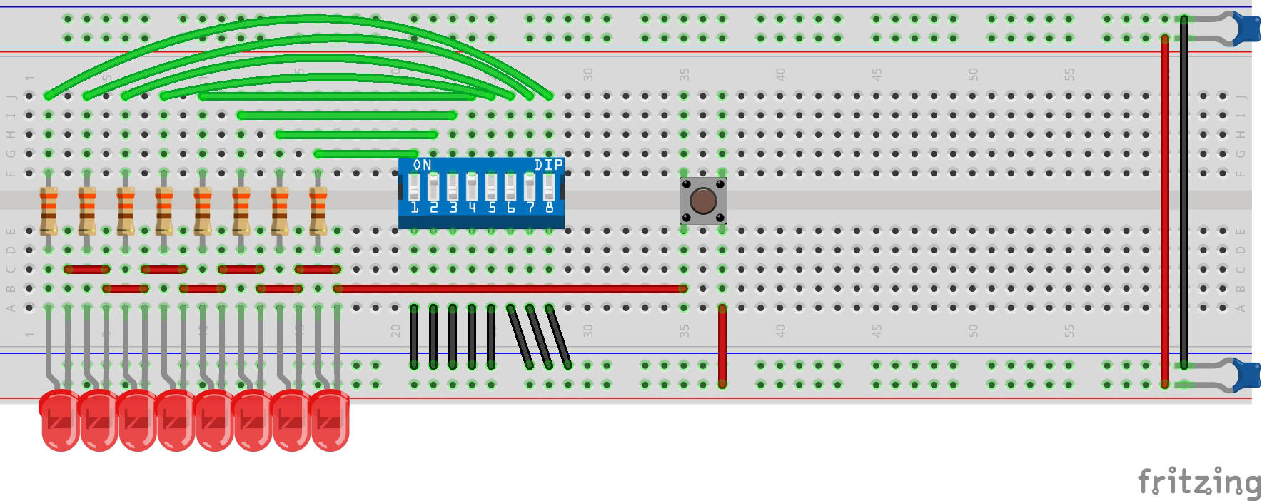 Une LED allumée correspond à 1, et une LED éteinte à 0. Vous utiliserez des interrupteurs pour définir le nombre binaire et un bouton-poussoir pour afficher le nombre binaire sur les LED.