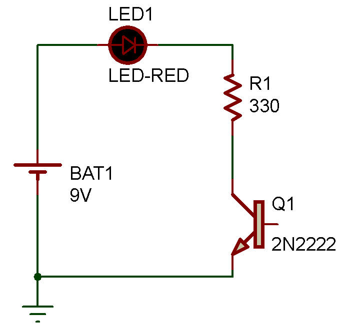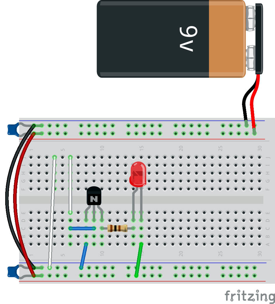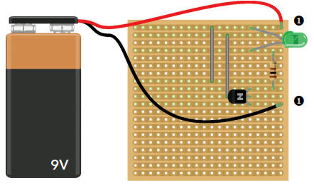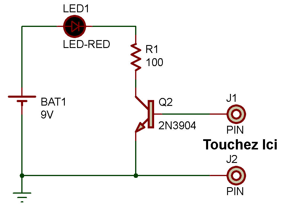 Ce circuit comprend un transistor, une résistance, une LED et une pile, comme celui de la section précédente.