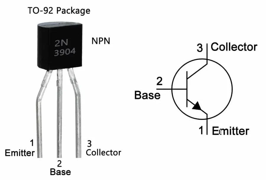 Dans un transistor NPN standard, ces trois pattes sont appelées émetteur, base et collecteur.