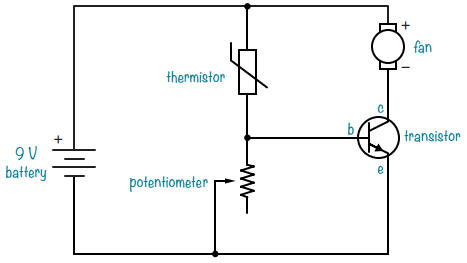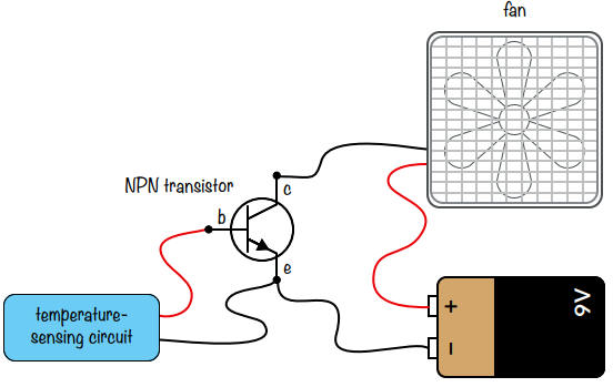 Si vous connectiez un fil du ventilateur au collecteur d'un transistor NPN, l'autre fil du ventilateur à la borne positive de la batterie et l'émetteur du transistor à la borne négative de la batterie, le transistor commanderait la mise en marche du ventilateur.