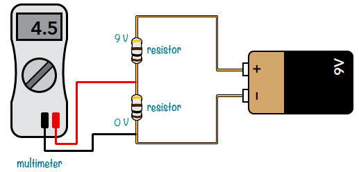 Si vous connectez deux résistances de même valeur entre elles et aux bornes positive et négative d'une pile, la tension à leur jonction sera la moitié de celle de la pile ; par exemple, 4,5 V avec une pile de 9 V.