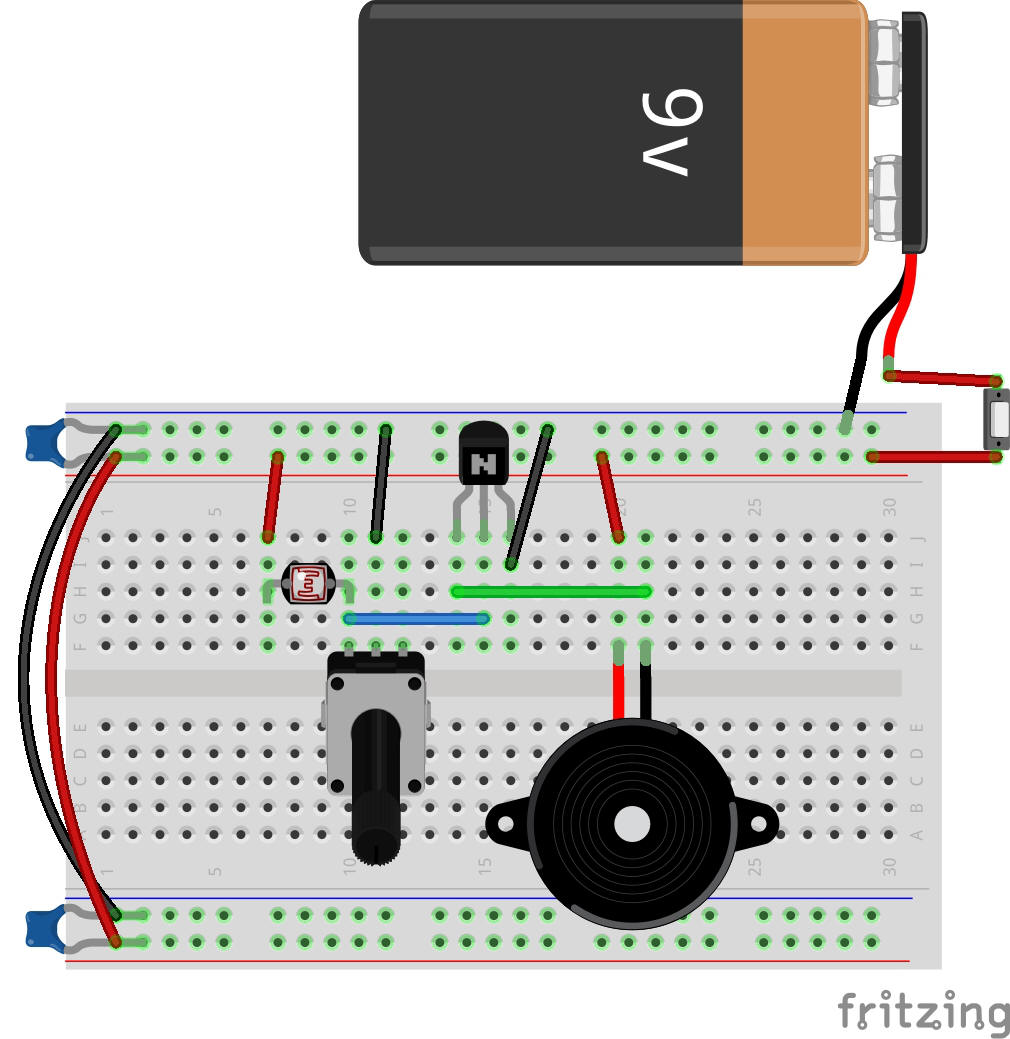 Ce projet utilise un transistor, une photorésistance, un potentiomètre et un buzzer.