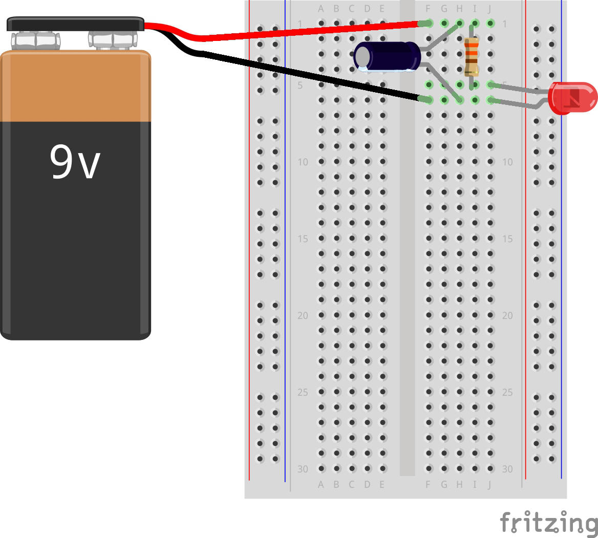 Il s'agit quasiment du même circuit que celui que vous avez construit dans le « Projet n° 9 : Votre premier circuit de platine d'expérimentation » section Créer de la lumière avec des leds, mais cette fois, vous allez ajouter un condensateur.