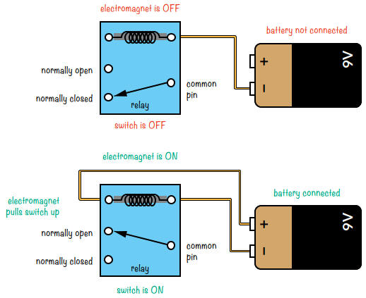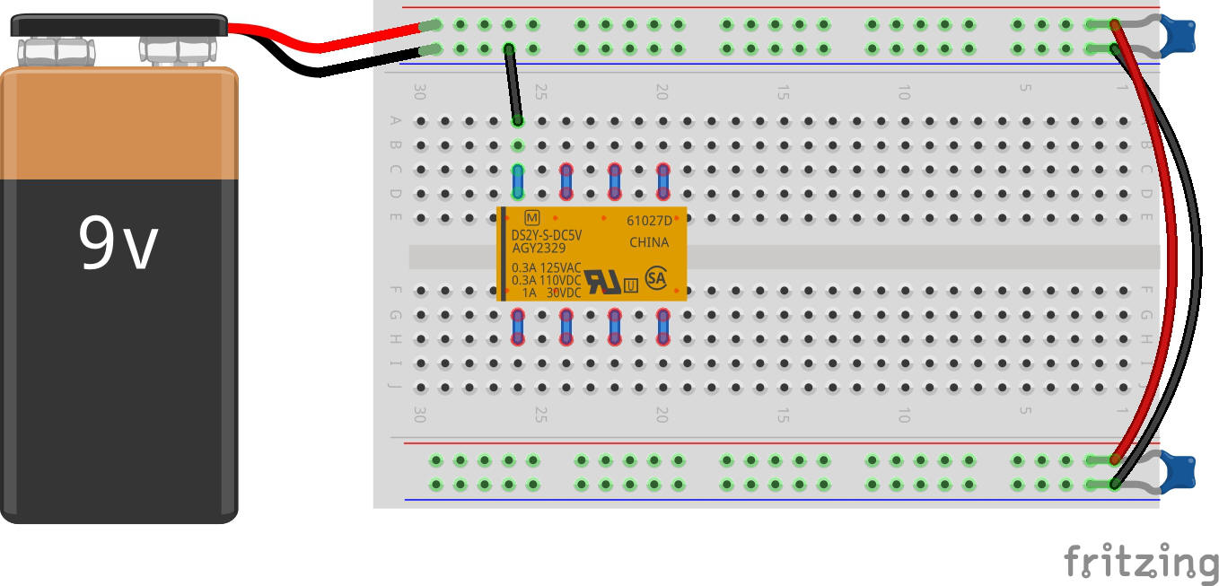 Branchez la pile 9 V : vous devriez entendre un tic-tac très rapide. Le relais s'allume et s'éteint. Débranchez la pile pour l'instant.