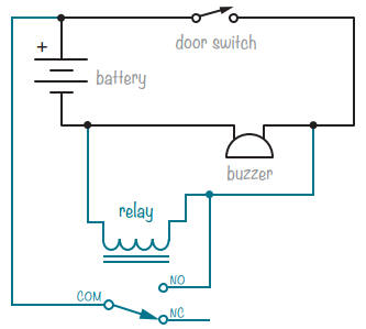 Ce schéma montre comment connecter le relais (en bleu) au reste du circuit (en noir).