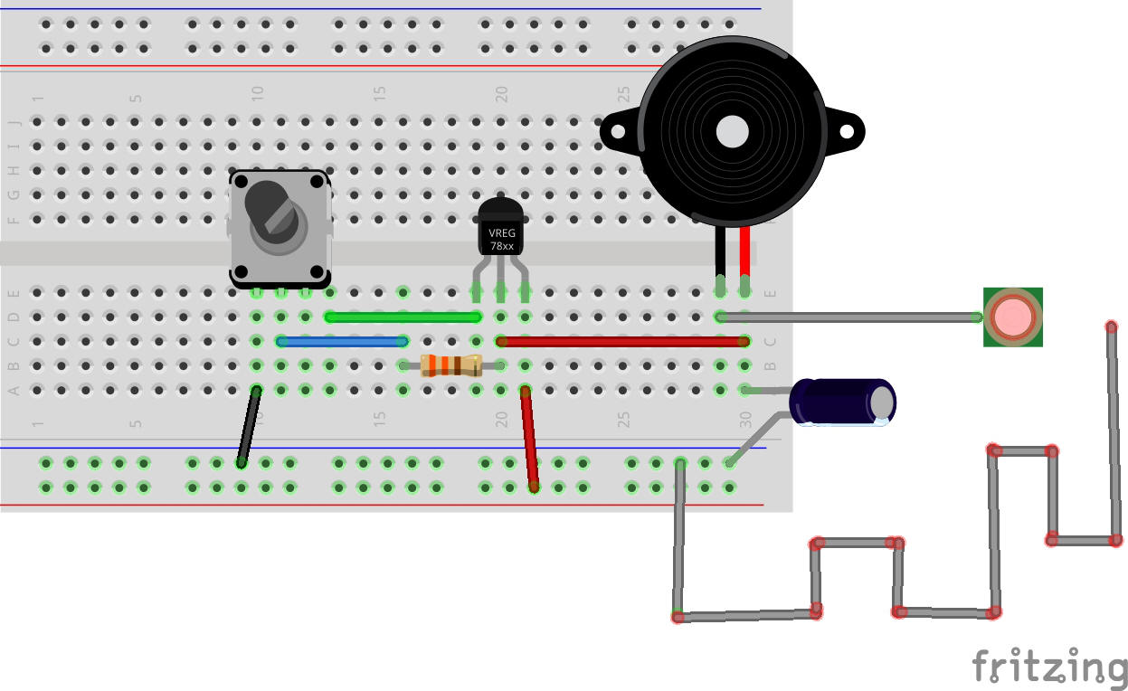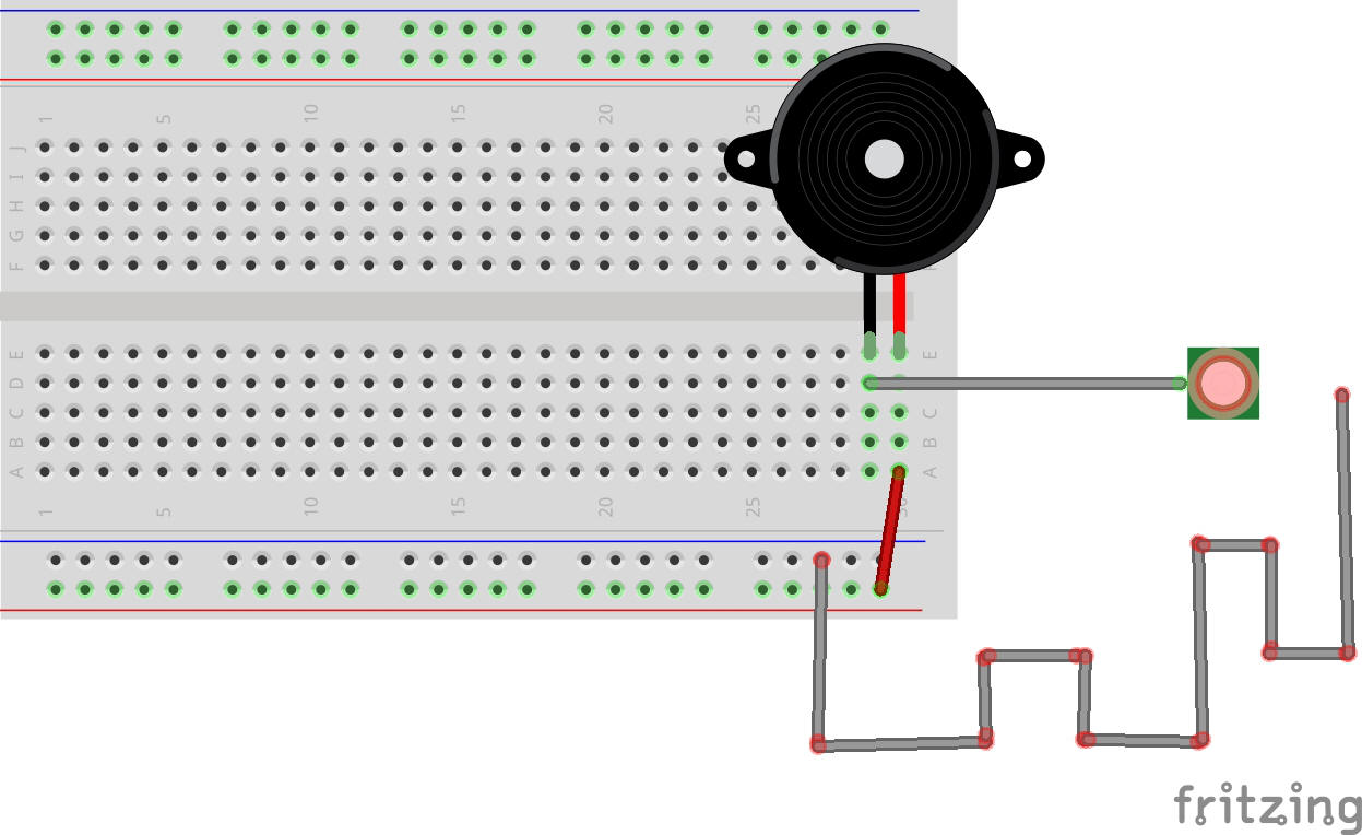 Il suffit de connecter le buzzer et la pile, à l'aide des repères noirs du schéma, à la plaque d'essai.