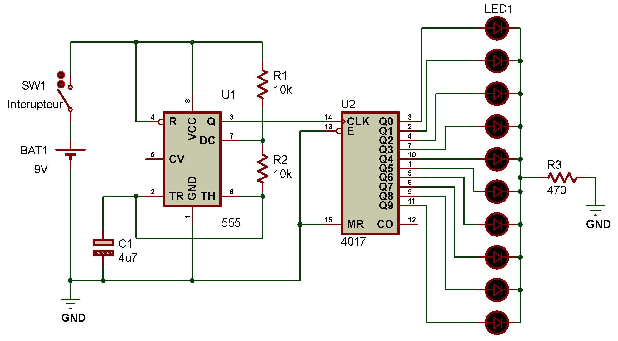 | U2 | 4017 | Circuit intégré de compteur décimal 4017 (decade counter) |