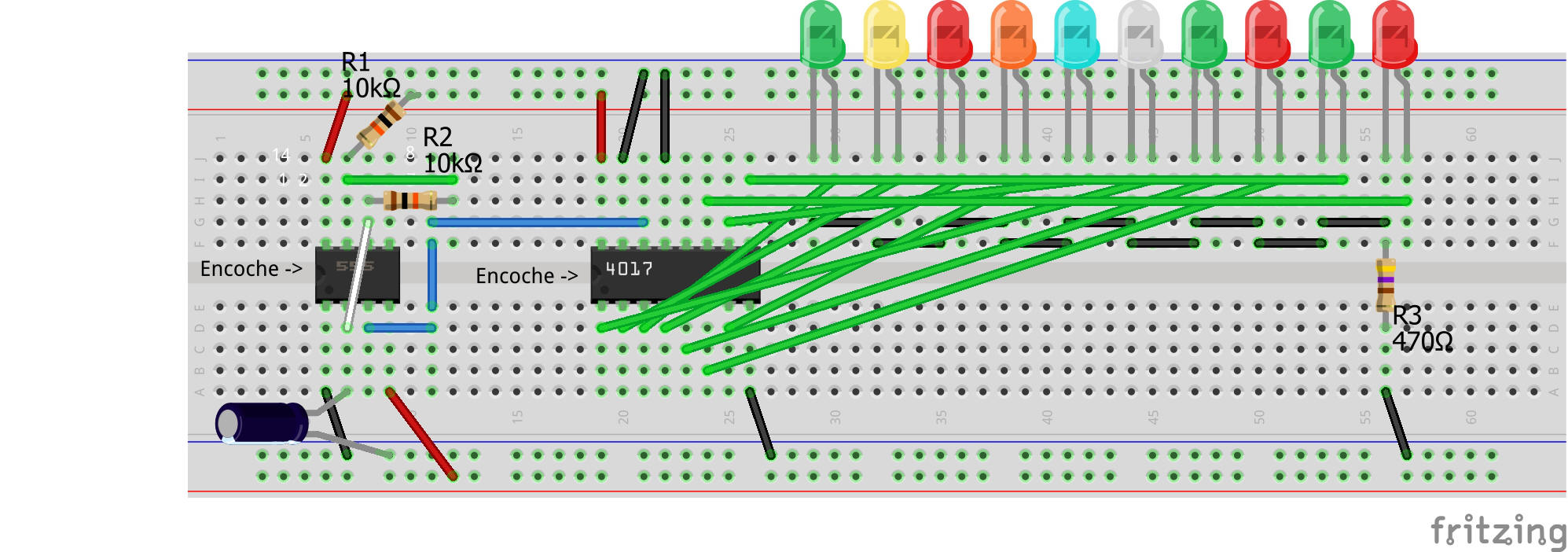 un timer 555 et un compteur décimal 4017, tous deux des circuits intégrés.