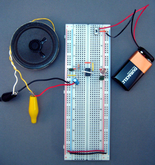 De même, là où le projet 8 utilise deux résistances et un condensateur pour contrôler la durée de l’alternance de tension sur la broche 3, ce circuit utilise une résistance, une photorésistance et un condensateur pour contrôler cette durée.