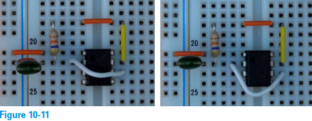 Au lieu d'utiliser deux résistances et un condensateur pour réguler la tension de sortie de la puce 555, comme dans le projet 9, vous utilisez une seule résistance, une photorésistance et un condensateur.