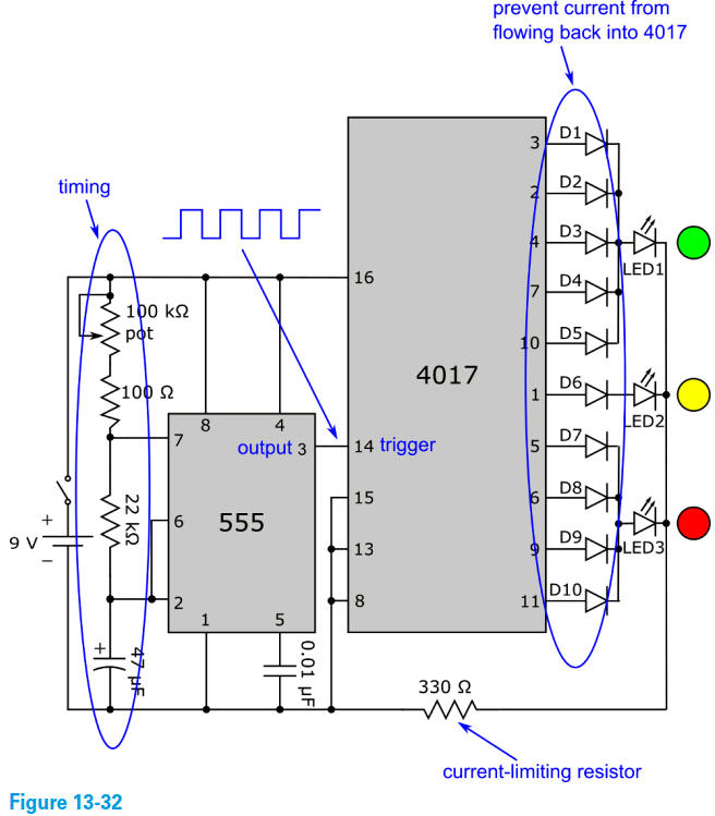La figure 13-32 présente le schéma du circuit original du feu tricolore.