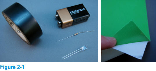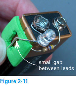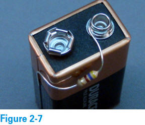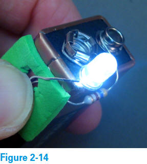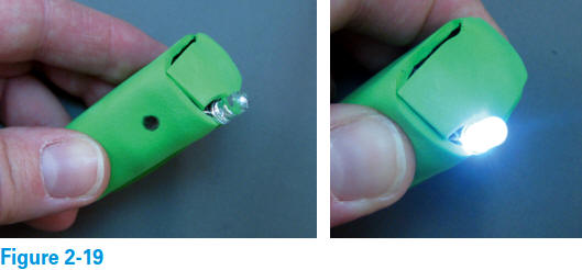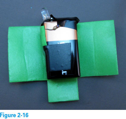Le schéma de la figure 2-22 représente votre circuit lorsque vous appuyez sur la découpe en mousse, ce qui met en contact les fils de la LED et de la résistance.