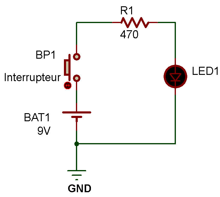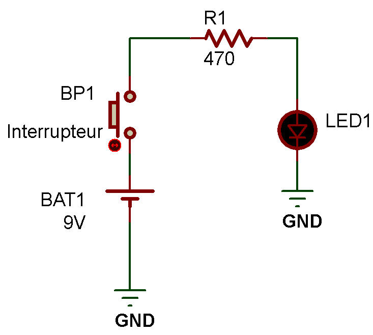 Dans un circuit lorsque qu'un composant est connecté au symbole GND, cela signifie qu'il est côté au négatif de la source d'alimentation (La pile 9V ici).