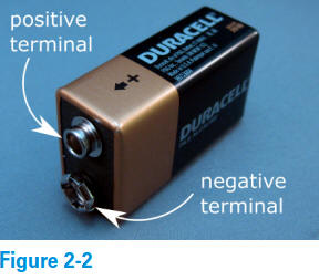 Chaque pile possède deux bornes : les pièces métalliques qui dépassent du haut d'une pile 9 volts (voir figure 2-2) ou les extrémités métalliques d'une pile AA, AAA, C ou D.