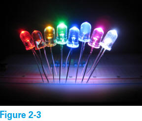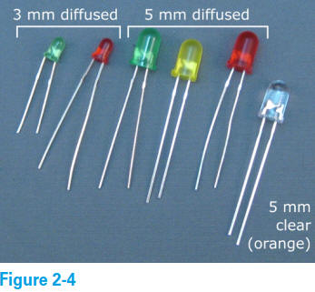 La figure 2-4 présente un assortiment de LED, dont une LED transparente de 5 mm émettant une lumière orange.