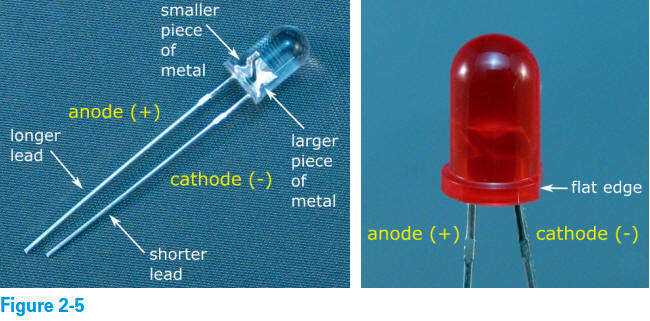 Le fil le plus court est la cathode (côté négatif) et le fil le plus long est l'anode (côté positif). (Voir la figure 2-5, à gauche.)