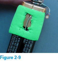 7. Collez le fil le plus long (anode) de la LED sur le côté de la batterie. (Voir Figure 2-13.)